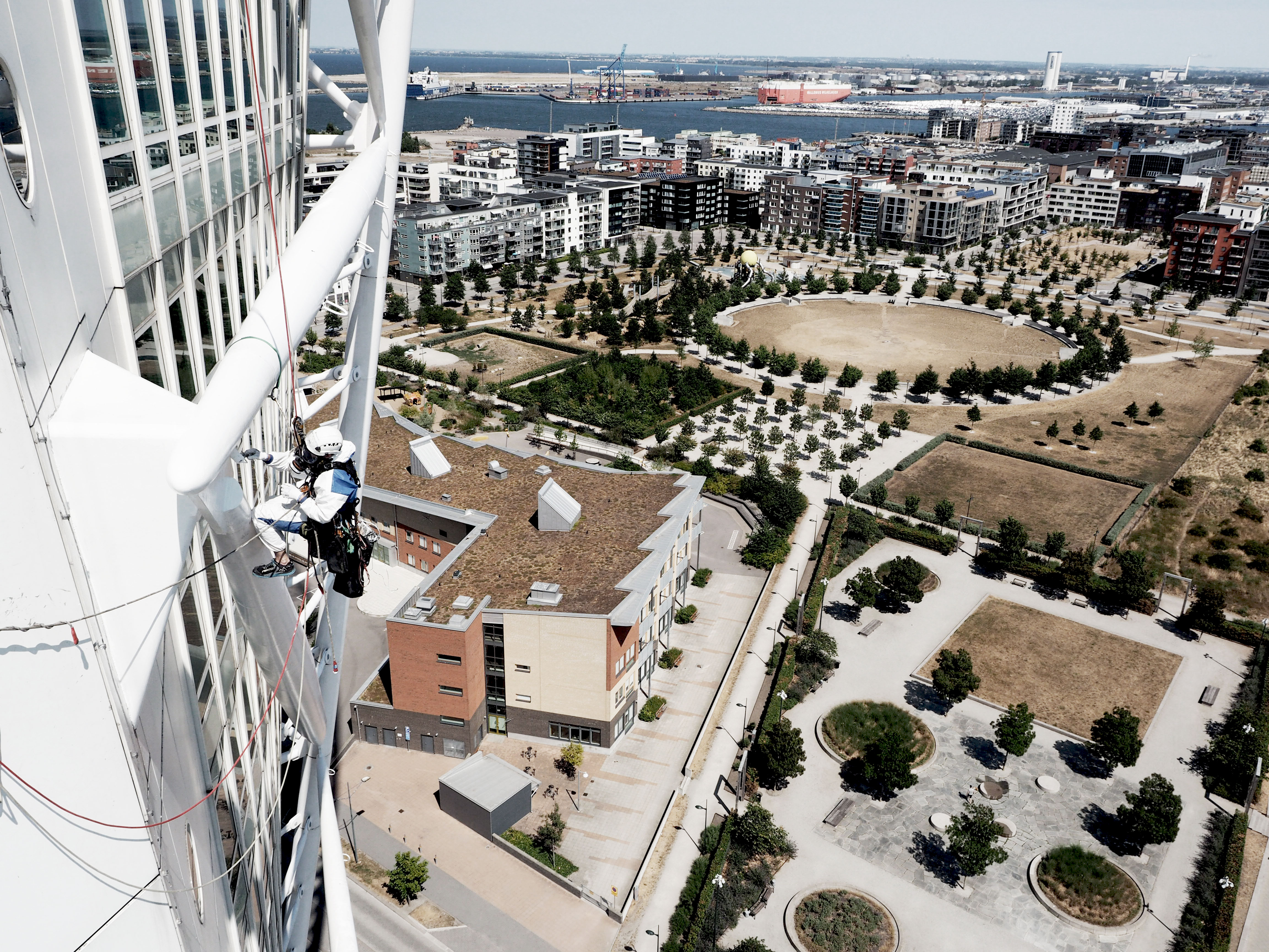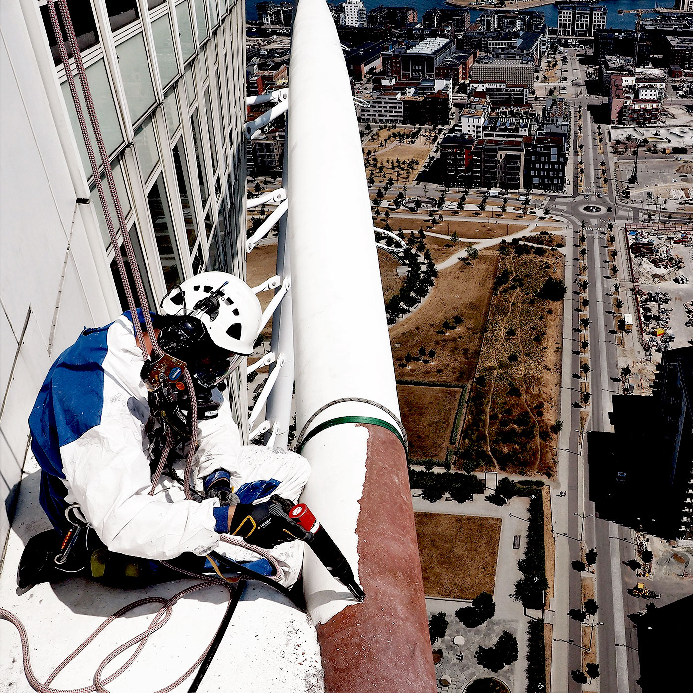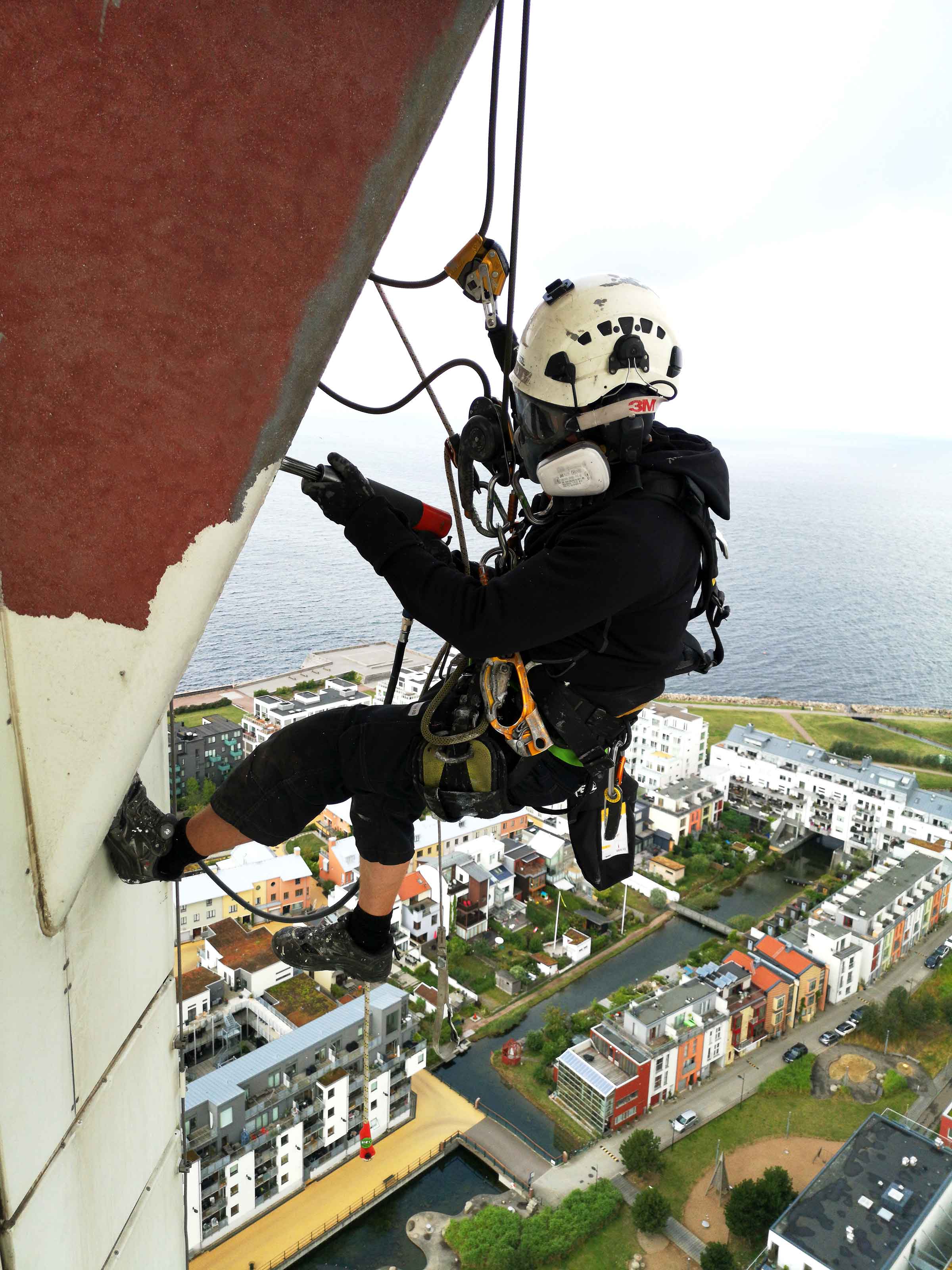 Turning Torso är Sveriges högsta skyskrapa med sina 190,4 meter. Byggnaden rymmer till större delen bostäder men också kontor och konferensvåningar. Vid underhållsarbete här är det ändå inte bara höjden som dikterar uppdragets ramar, det är också fastighetens vridning som gör det utmanande att komma åt överallt.