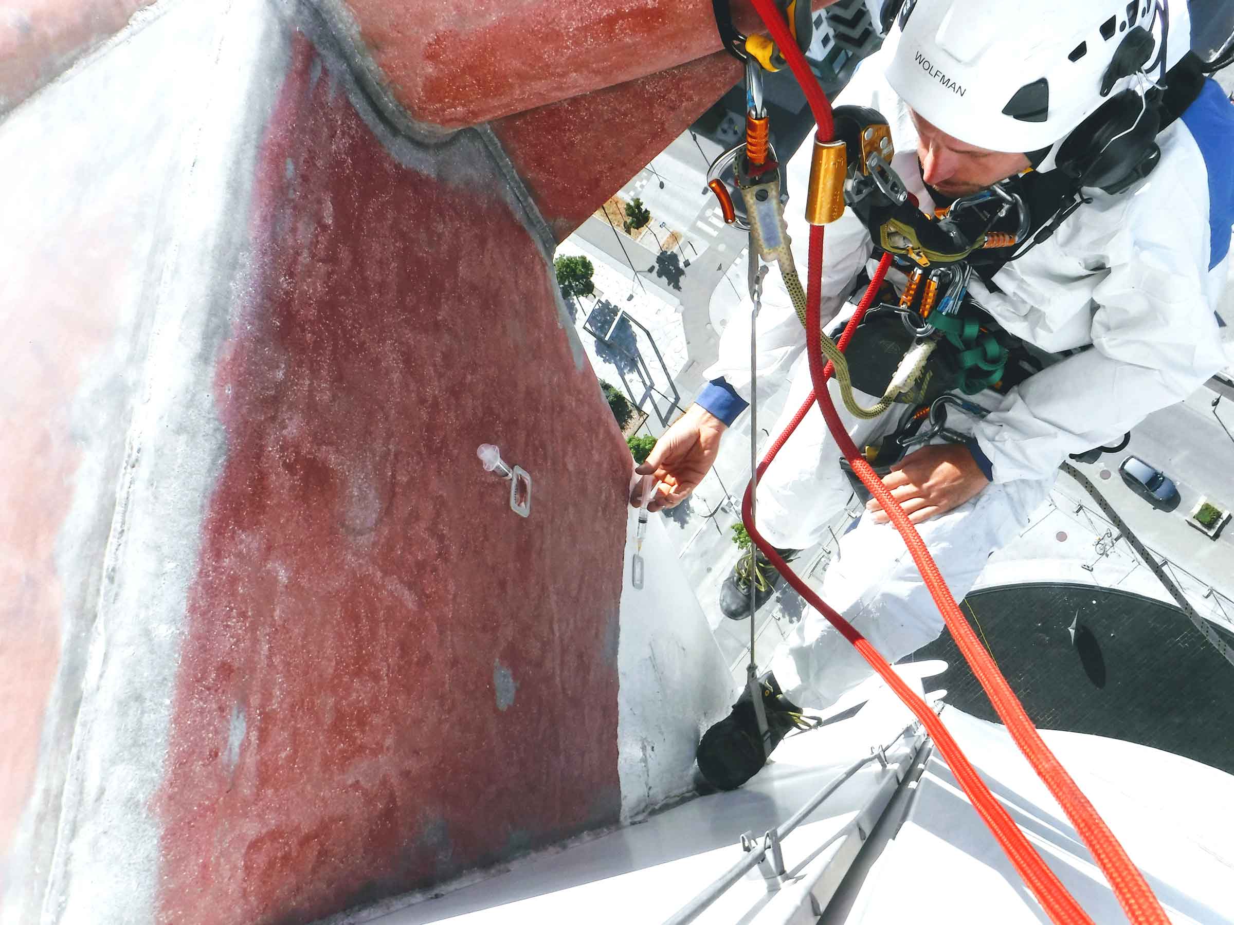 När en byggnad roterar ett kvarts varv från topp till botten kan vi inte bara arbeta uppifrån och ner, utan måste följa byggnadens vridning. Därför krävdes en uttömmande riskanalys och räddningsplan. Parallellt tog vi fram ett omfattande målningsprogram med en metodbeskrivning som innefattade bland annat mätningar av stålets profildjup, salt, ståltemperatur, luftfuktighet, daggpunkt och tjockleken på färglager. Rostskyddsmålning på så hög höjd är ett ytterst väderberoende uppdrag. Därför använde vi de dagar måleriarbetet stod still till att fortsätta en redan påbörjad inspektion av fastighetens stålkonstruktion.